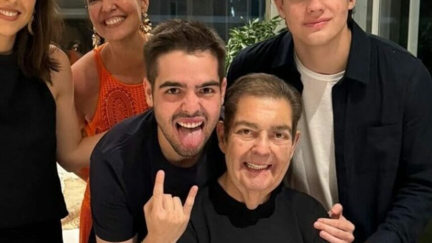 Faustão apareceu em uma imagem rara publicada no Instagram e posou ao lado da família durante a celebração dos 24 anos de casamento com Luciana Cardoso. A reunião ocorreu em clima íntimo, com a presença de João Silva e Rodrigo. O apresentador surgiu sorridente na foto, demonstrando emoção ao marcar a data especial. Na legenda da foto, João escreveu: “Comemorando os 24 anos de união das pessoas que mais amo nesta vida!”, reforçando o ambiente de afeto entre todos.