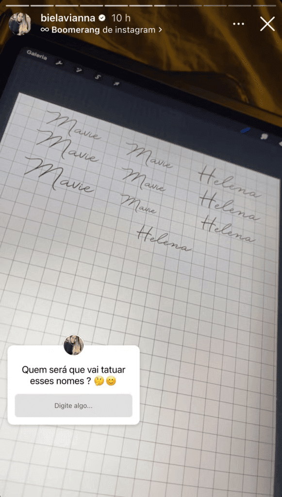 “Quem será que vai tatuar esses nomes?”, escreveu a tatuadora ao mostrar as opções de caligrafia dos nomes. Biela confirmou que Rafaella irá tatuar, e será feito em uma clínica médica.