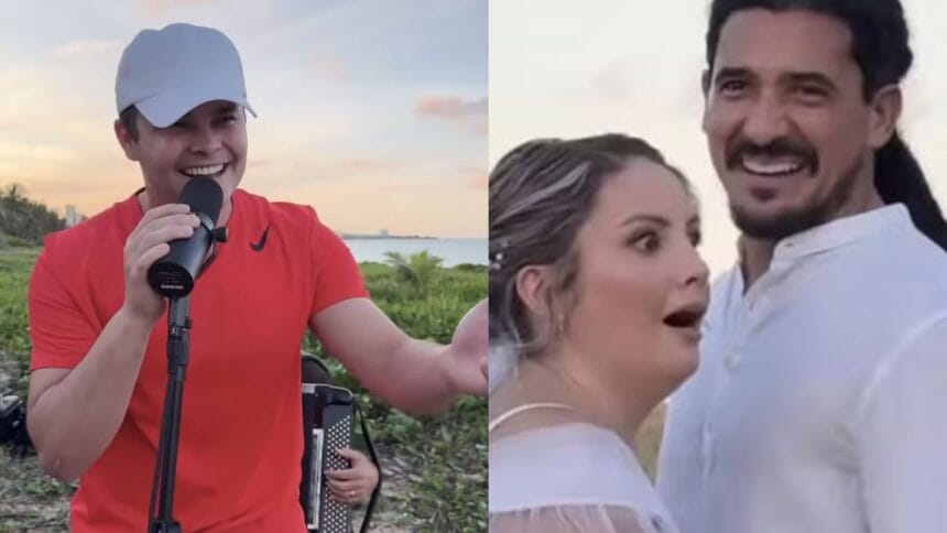 A cerimônia era simples, realizada à beira da areia, com poucos convidados e um músico já presente no local para embalar o momento. Sentado próximo, Matheus aguardou o momento certo para se aproximar e pediu ao músico da cerimônia que desse o tom da canção “O Nosso Santo Bateu”, um dos maiores sucessos da carreira da dupla. Sem que o casal percebesse quem estava cantando, Matheus soltou a voz no exato momento em que os noivos assinavam os documentos do casamento civil.
